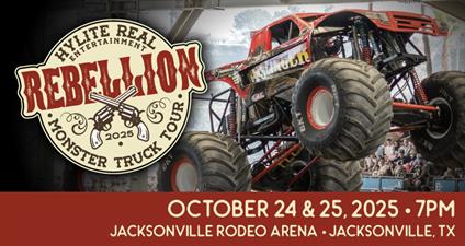 Monster Trucks will roar into Jacksonville Rodeo Arena October 24-25 for the 2025 MONSTER TRUCK REBELLION TOUR presented by HyLite Real Entertainment! See GunSlinger, Equalizer, Lethal Injection, Outlaw Wrangler, and more battle in Best Trick, Racing & Freestyle.