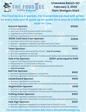 The FrosTee is a 4-person, Par 3 scramble packed with prizes on every hole and 18 spots up for grabs for a shot at a $100,000 Hole-in-One.