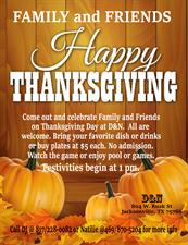 Come out and celebrate Family and Friends on Thanksgiving Day at D&N. All are welcome. Bring a dish or drinks or buy plates at $5 each. No admission. Watch the game or play pool or games.